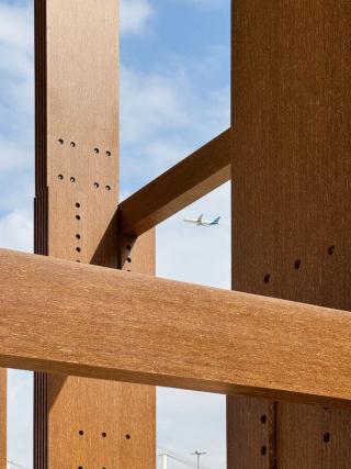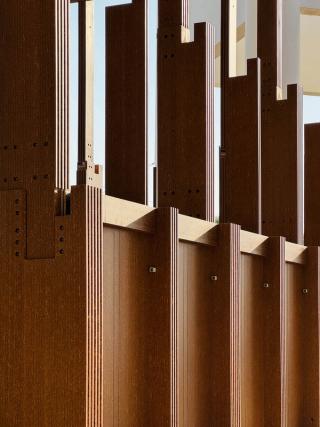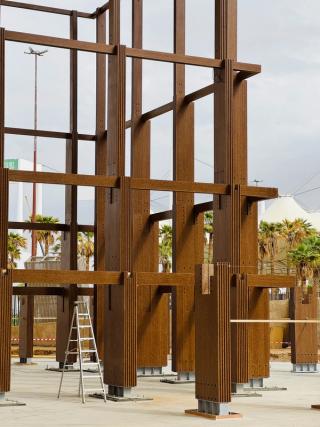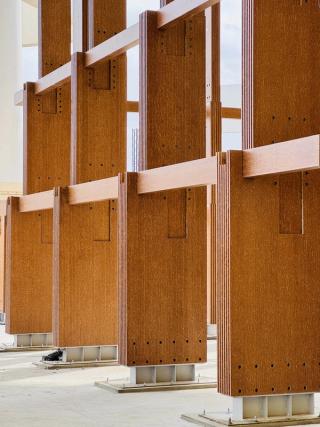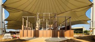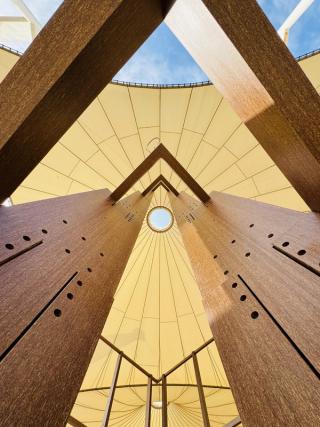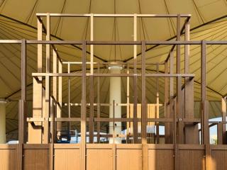 AlMusalla's assembly process emerges from a grid of palm tree plantations, becoming the field's guiding principle. It organizes and regulates a modular construct, bringing together timber elements, composing membranes and concealing spaces.