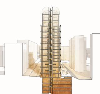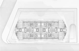Blurring the boundaries between interiors and exterior spaces, the journey continues outside and connects to the vegetated park below through planted vegetated loggias. Above, the suspended townhouses are topped with green houses, simultaneously transparent and reflective, diffusing natural light and dissipating heat throughout the building.