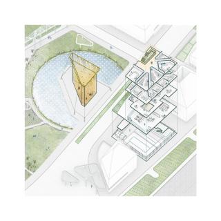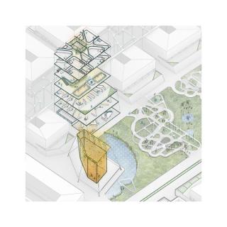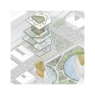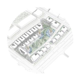 Multi-functional blocks on the fringes of the oasis house different hubs for production: workspace as well as residential units. This creates a sense of the deconstruction of traditional hierarchies of the general massing around three monumental agoras.