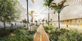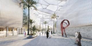 The site’s ambitious sustainable strategy includes the presence of water ponds, sand dunes, wind towers and mist canopies that collectively compose, connect and organize the site. The ground surface is strategically thickened and defined by deliberate emergences on the existing, rigid grid of the former industrial site, creating a sense of planned order and intention.